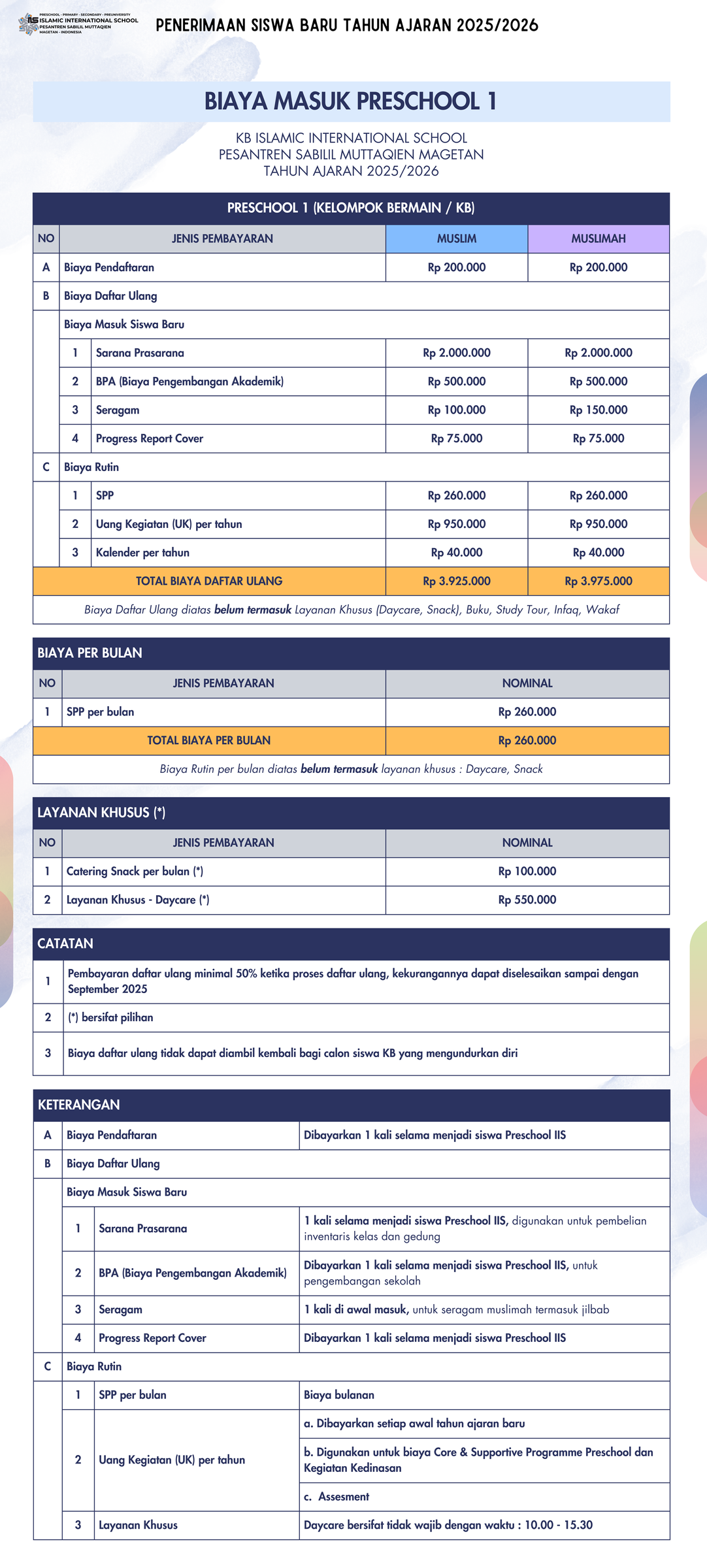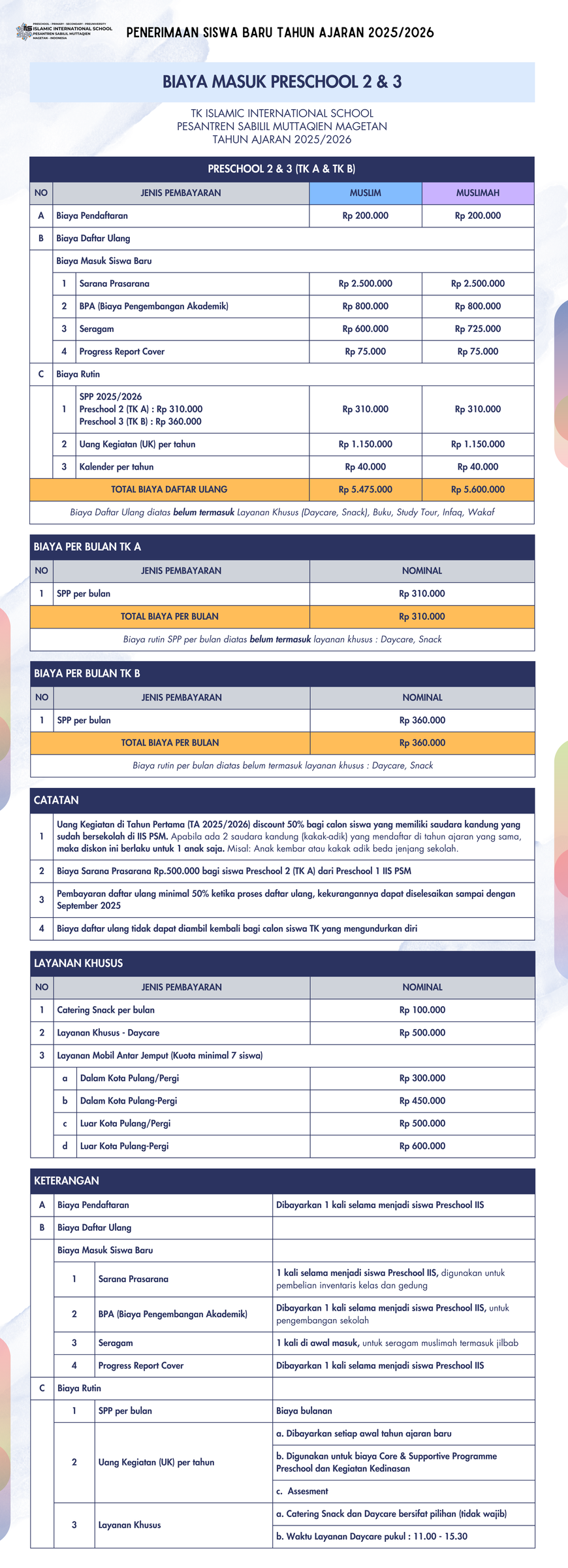 Informasi Biaya Masuk KB-TK IIS PSM Magetan (Preschool 1&2)